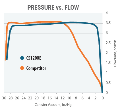 - Récupération optimale des composés selon la méthode TO-15 : Le CS1200E prélève dans un canister à un débit constant avec une meilleure récupération des composés, même à des niveaux sub-ppb